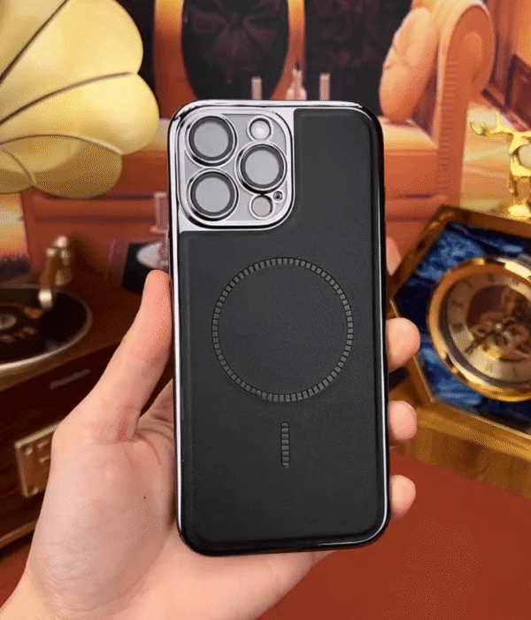 Luxury leather MagSafe case with HD lens protection — stylish, slim & durable. Available in black and brown.
