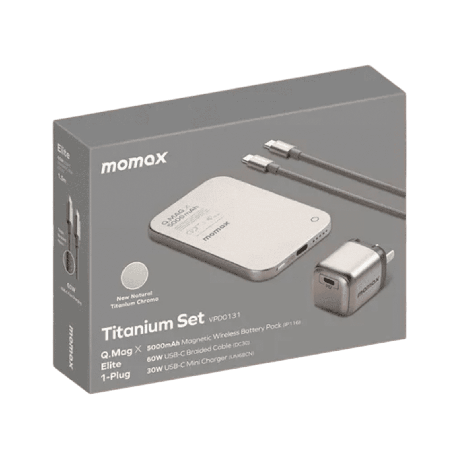 Momax Titanium Set VPD0131 Q.Mag X 5000 mAh Wireless Battery Pack 60W USB-C Cable and 30W Adapter